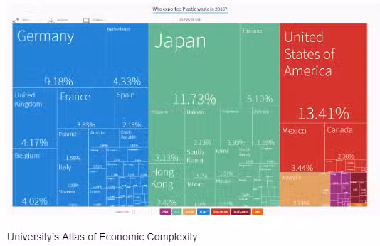 In 2016, 46% of all plastic waste export in the world went to China. Europe exported most, 2,9 billion of metric tonnes. That’s at least 40 % of Europe’s plastic waste. The Netherlands and Belgium are among the world’s top exporters of plastic waste. In 2016, they both had a part of 4 percent of the world’s export, according to the Harvard University’s Atlas of Economic Complexity.