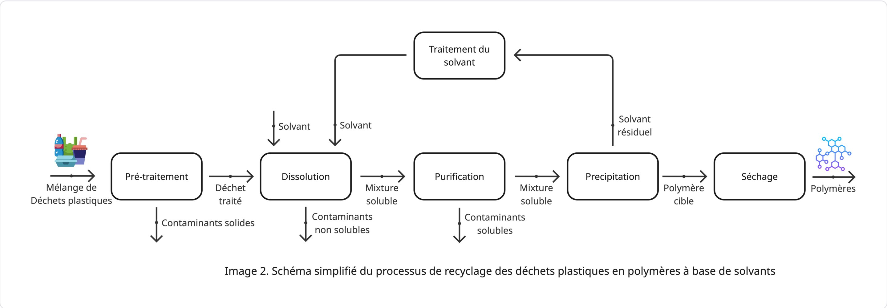 Le processus simplifié est illustré dans la figure 2[1,5,6,7]. Après tri, lavage, séchage et broyage, le polymère cible est dissous dans un solvant approprié. Le solvant est choisi de manière à rendre le polymère soluble, tandis que la plupart des impuretés – telles que les étiquettes, les encres, les charges ou d’autres polymères – restent solides. Les impuretés solides et dissoutes sont éliminées par des étapes de purification. Cela améliore la qualité finale du polymère.