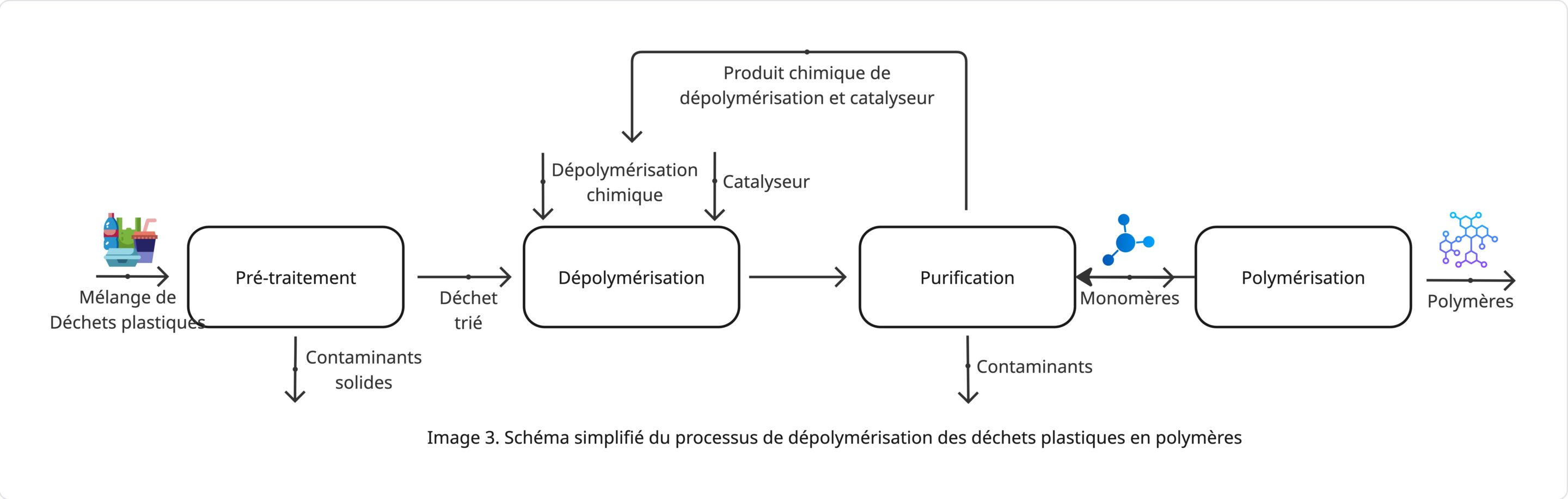 Le processus est illustré dans l’image 3[1,10]. Après le prétraitement des déchets plastiques, les chaînes polymères sont décomposées en monomères ou oligomères à l’aide d’un produit chimique spécifique et d’un catalyseur. Les contaminants résiduels, les résidus de catalyseur et les sous-produits sont éliminés au cours d’étapes de purification (précipitation, filtration, distillation). Le catalyseur et le réactif utilisé peuvent généralement être récupérés et réutilisés. Le produit final est un monomère pur, qui peut ensuite être polymérisé pour fabriquer du plastique neuf.