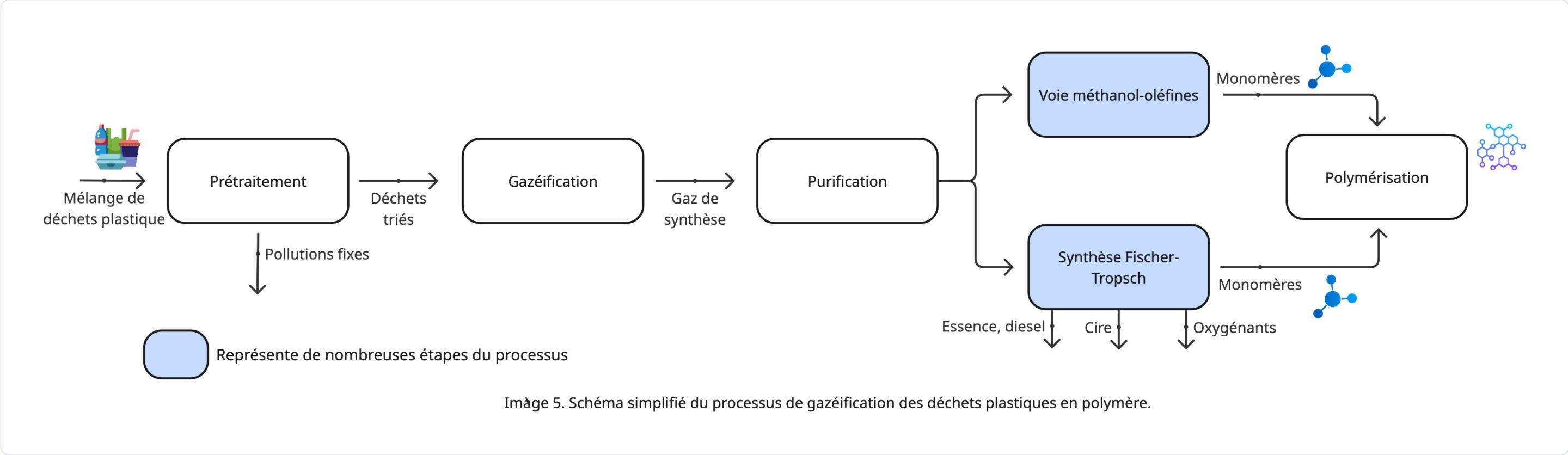 Les étapes du processus de gazéification sont illustrées dans l’image 5[1, 5, 19, 20]. Après avoir trié et séché les déchets, qui sont parfois mélangés à de la biomasse, les matériaux sont chauffés. Les polymères se décomposent alors complètement en molécules de gaz simples, ou syngaz. D’un point de vue technique, le processus est similaire à la gazéification du charbon ou de la biomasse, mais la stabilité thermique des plastiques rend les gazéificateurs traditionnels moins adaptés à cette application.