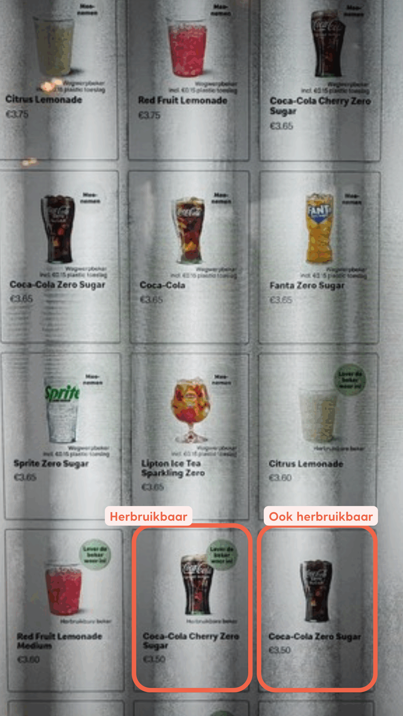 - Bij een deel van de herbruikbare bekers voor dine-in staat geen informatie in het bestelproces: het is dus niet duidelijk in wat voor beker je je bestelling krijgt (en wat je ermee moet doen). Bijvoorbeeld: bij Coca Cola Regular staat ‘herbruikbare beker’ en bij Coca Cola Zero staat geen informatie (terwijl dat ook in een herbruikbare beker wordt geschonken). Nb: Geldt niet voor alle gecheckte restaurants (foto 5);